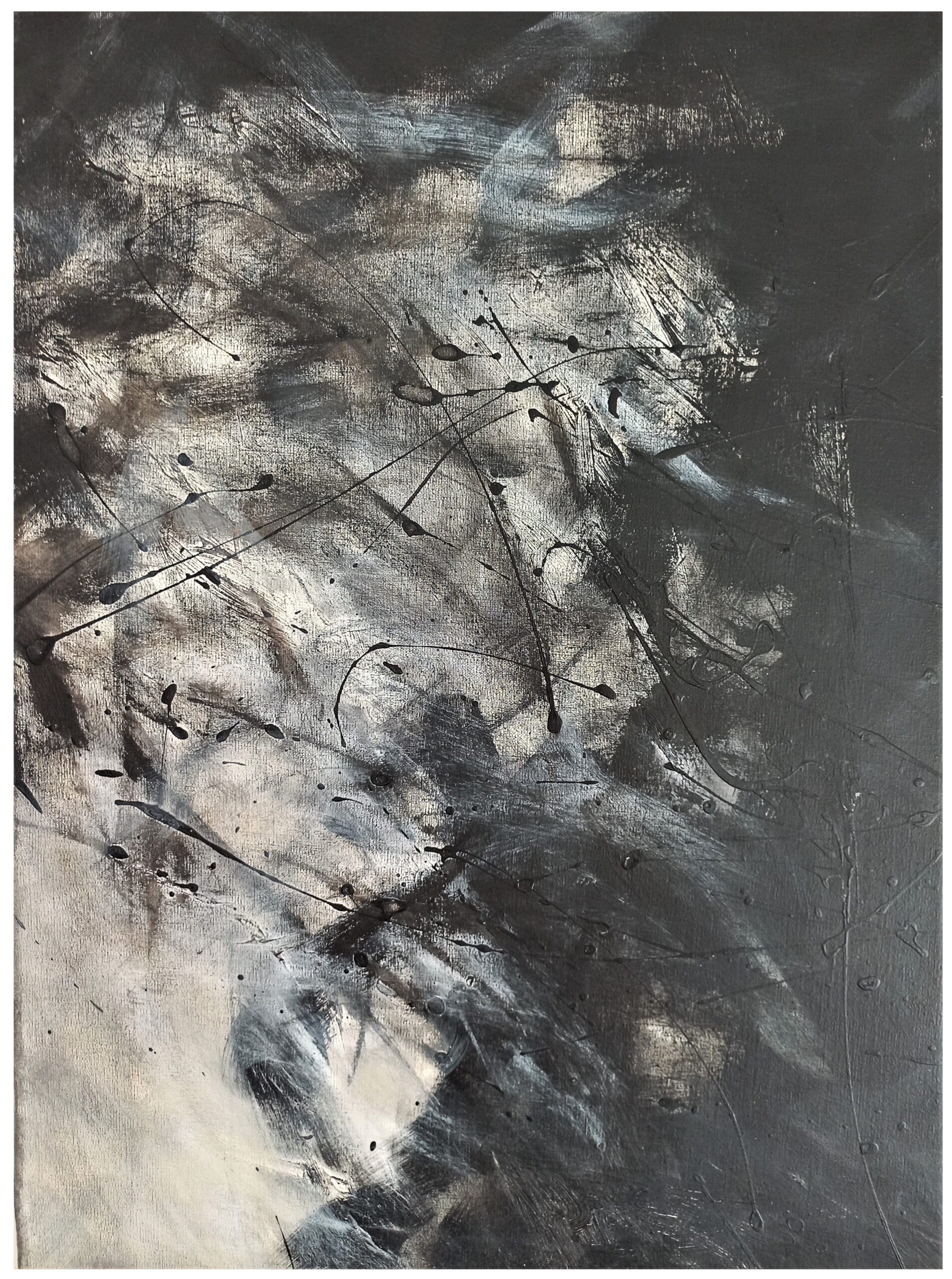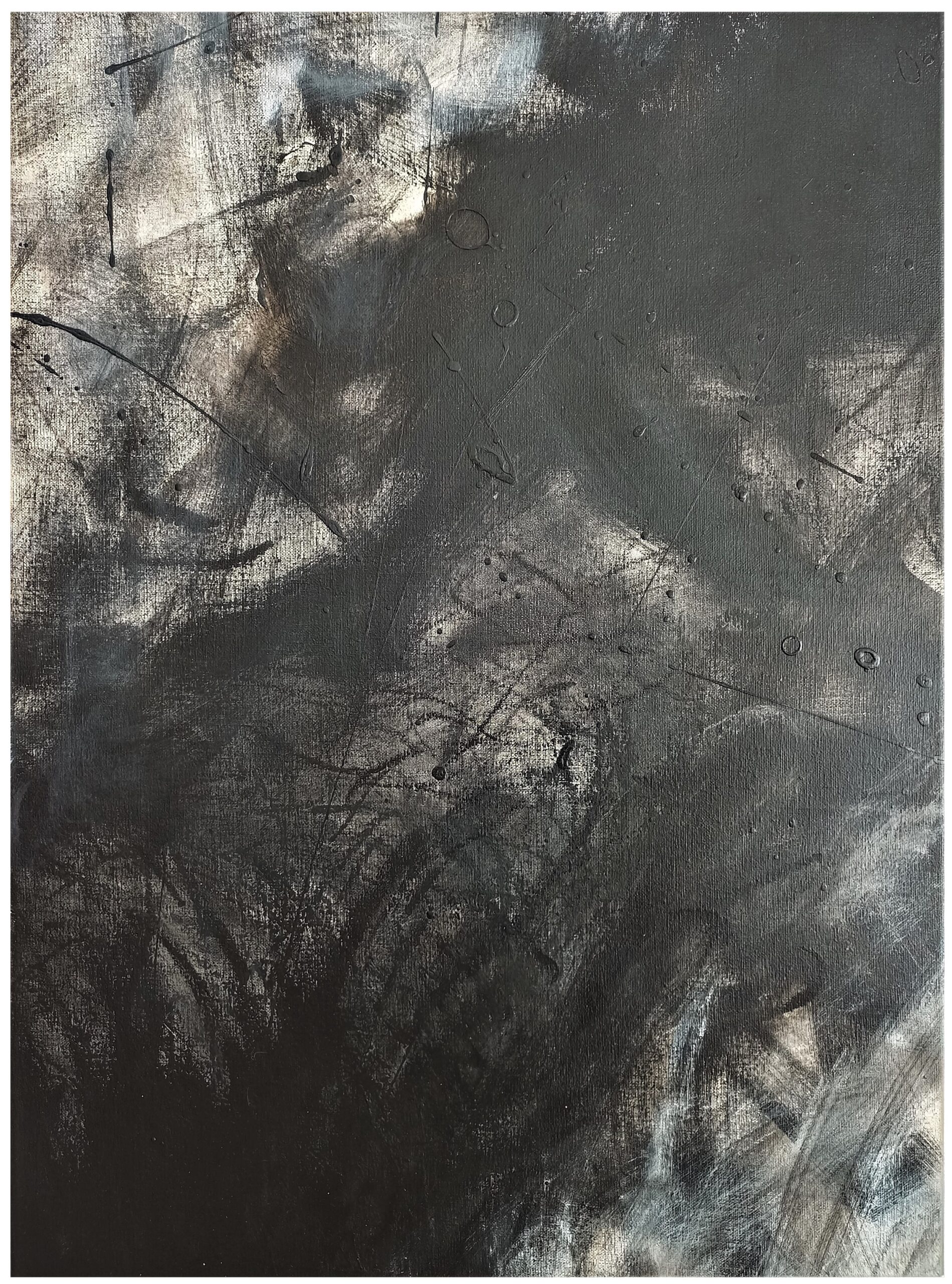 Pinceladas frescas de acción, sobre un dibujo en grafito diluido con aguarrás, libres de representar imágenes conscientes o de capas superficiales del inconsciente.
